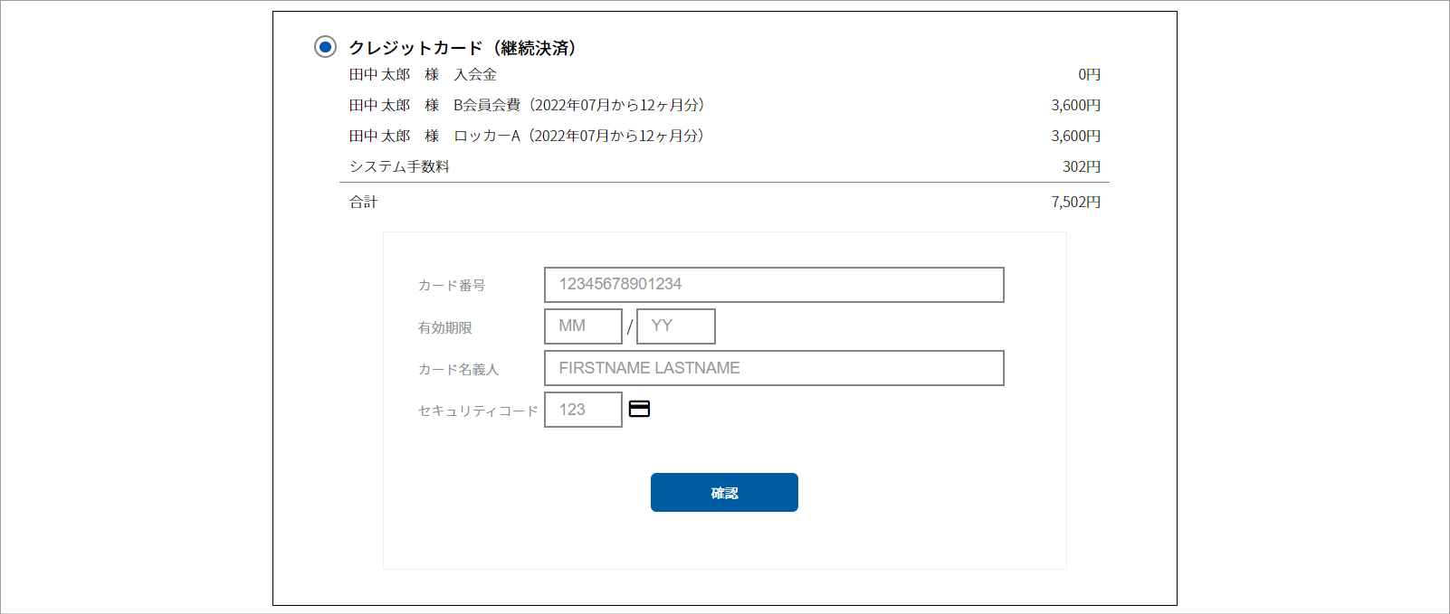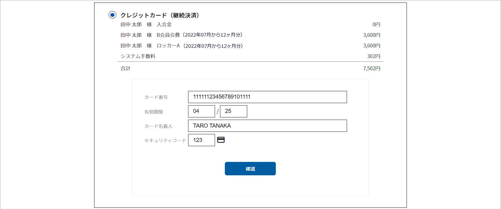 ②クレジットカード情報を入力し、「確認」をクリックします。