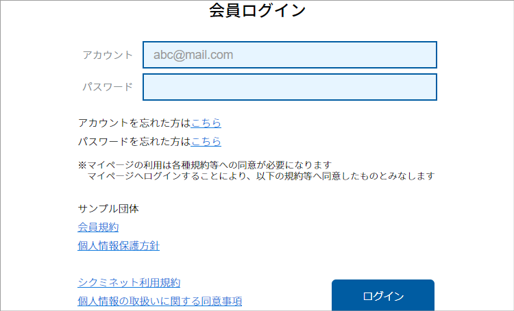 ②管理者から案内された「アカウント」「パスワード」を入力し、「ログイン」をクリックします。
