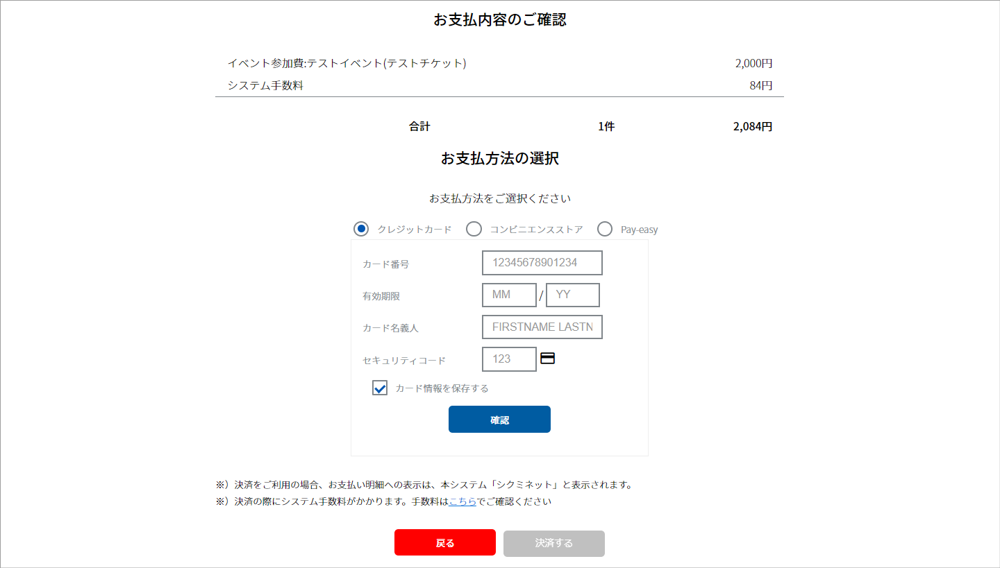 ③クレジットカード情報を入力し、「確認」をクリックします。